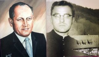 Das Bild zeigt Gregor Umhof, Bürgermeister von 1954-69 und Viktor Wildschütte, Pfarrer und Stifter des Hilsenhofs.
